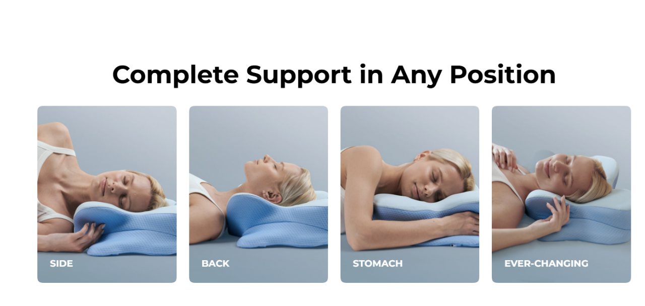 Back sleepers enjoy neck cradling; side sleepers get shoulder alignment; stomach sleepers find neutral comfort.